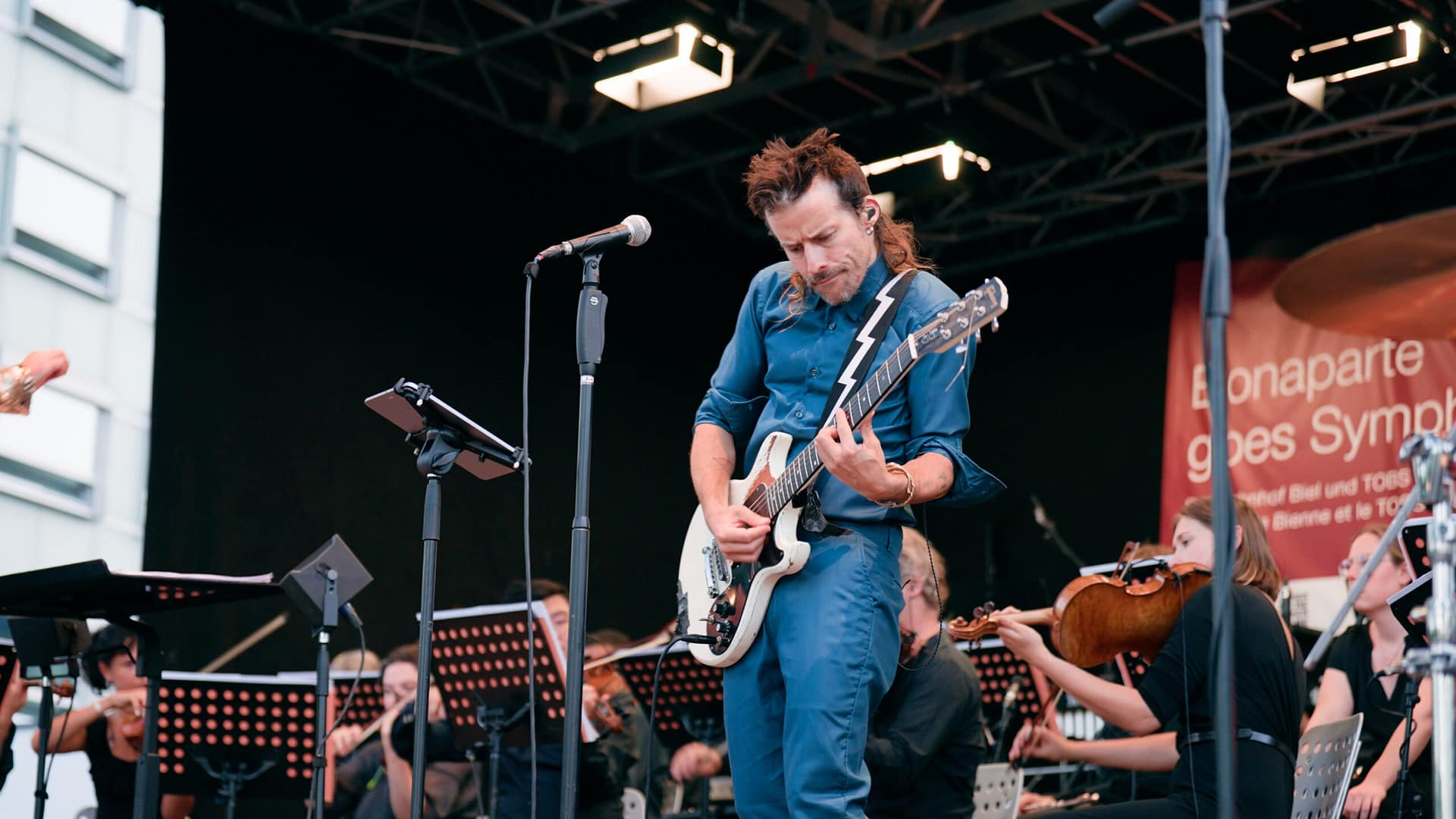 Le Bernois Droujelub Yanakiew, directeur de l’Orchestre symphonique Bienne Soleure et violoniste, chef d’orchestre et arrangeur, est un bâtisseur de ponts musicaux. Après le succès de ses projets mixte avec Steff la Cheffe et les Kummerbuben, il s’est lancé dans une nouvelle combinaison qui réunit des univers sonores très différents. Et c’est ainsi que l’artiste suisse de renommée internationale Bonaparte s’est joint à l’orchestre sur scène pour créer un événement exceptionnel mélangeant des sons puissants et des sons plus doux et créant un moment musical inoubliable à la gare, en plein cœur de la ville de Bienne.