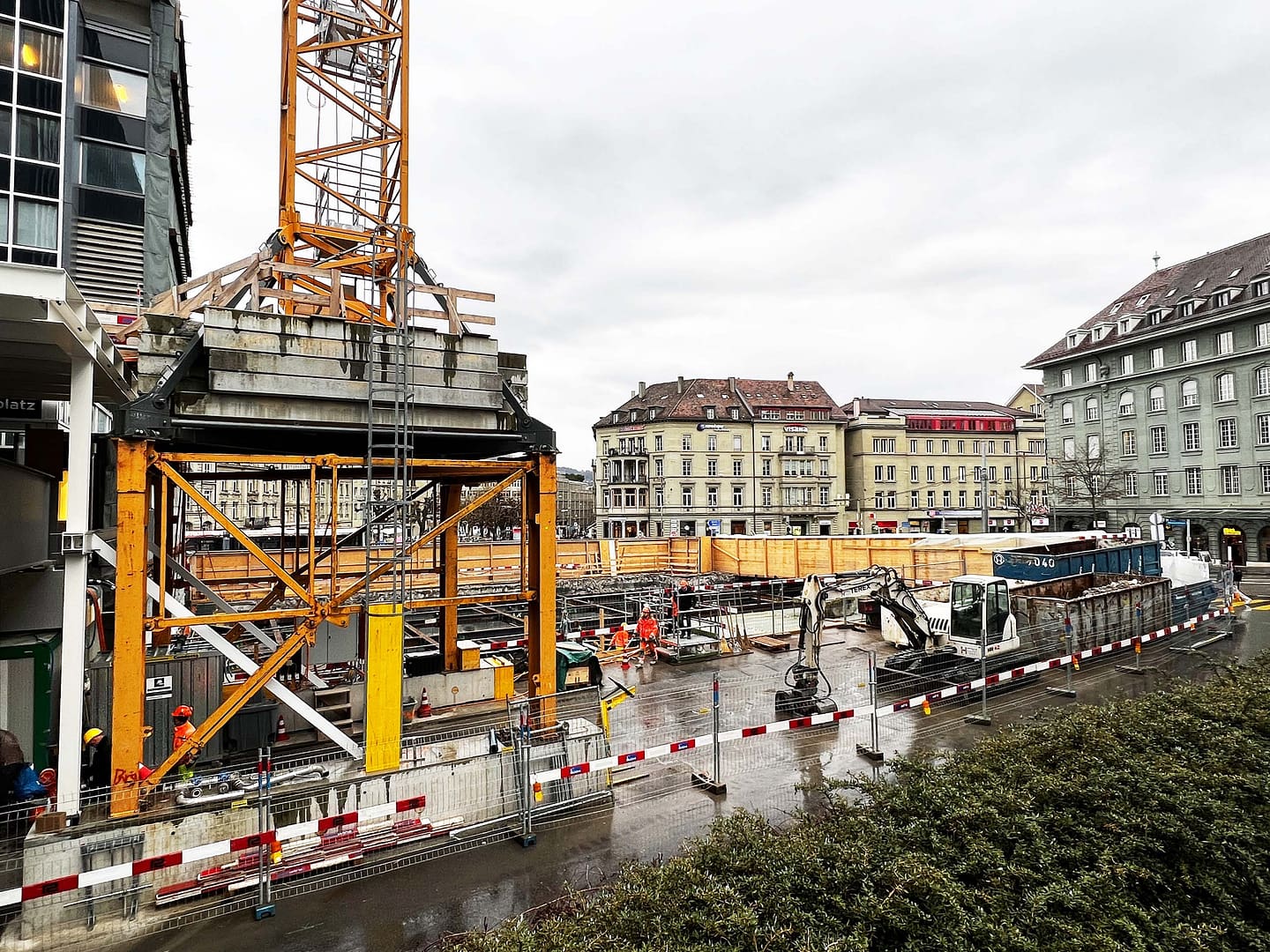 Nach dem Rückbau des Gebäudes bis in die Untergeschosse konnte die SBB anfangs März die Rohbauarbeiten für den Neubau starten. Bis Ende Jahr werden wieder ein bis zwei Geschosse sichtbar sein. Die Rohbauarbeiten dauern voraussichtlich bis Ende 2024, anschliessend erfolgt der Ausbau des neuen Gebäudes. Fussgänger und Fussgängerinnen können die Baustelle jederzeit via Holztunnel passieren.