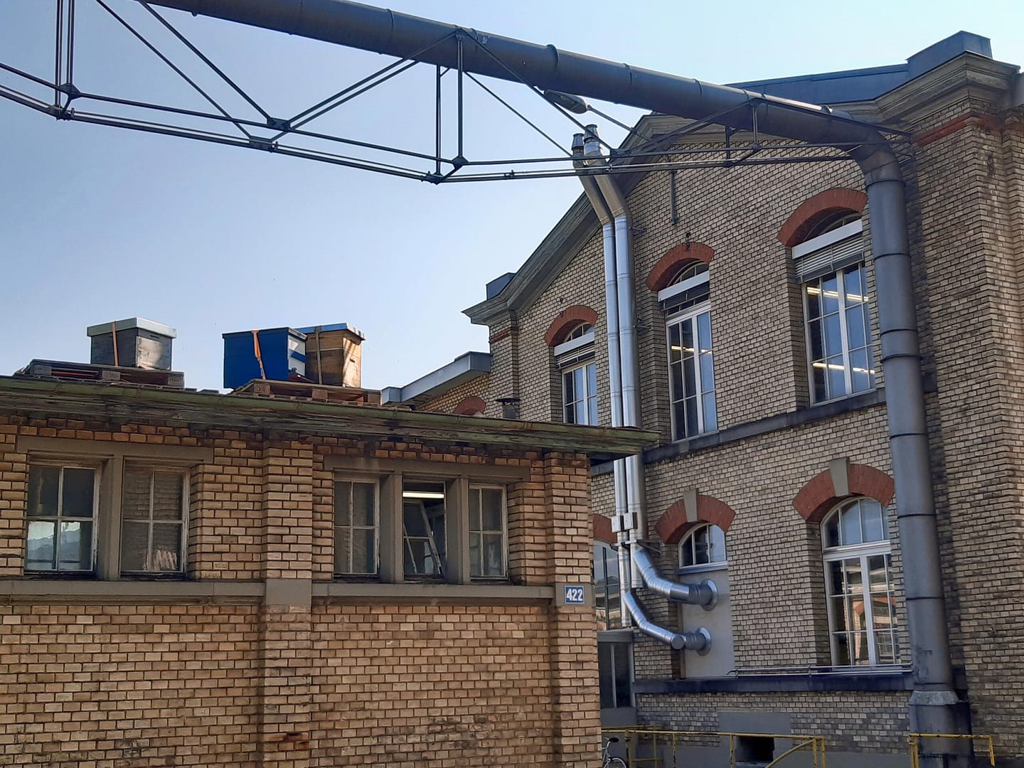 Dies brachte Flavio Gerster und Remo Rothenberger auf die Idee, dass eine Imkerei sehr gut auf das Areal passen würde. Seit Mai stehen auf dem Dach eines Gebäudes zwei Bienenstöcke. Im Laufe des Jahres sollen weitere dazukommen. In der Stadt gibt es eine grosse Biodiversität (Balkon-Pflanzen, Schrebergärten, Blumeninseln), so dass Bienen von Frühling bis Herbst immer Nahrung finden. Zusätzlich sind Alleen aus Rosskastanien oder Linden sehr ertragreich an Nektar. Auf dem Werkstadt-Areal befinden sich solche Bepflanzungen, Magerwiesenblumen und Primeln auf Bahndämmen in direkter Nähe. Nicht zu vergessen die Hohlstrasse mit ihren Kastanien. 90% der Nahrung finden die Bienen in einem Radius von 2,5 Kilometern. Eine erste Honigernte erwarten die beiden Freizeit-Imker im Sommer. Für die Biodiversität am wichtigsten bleibt jedoch die zentrale Funktion der Bienen als Bestäuberin von Nutz- und Wildpflanzen.