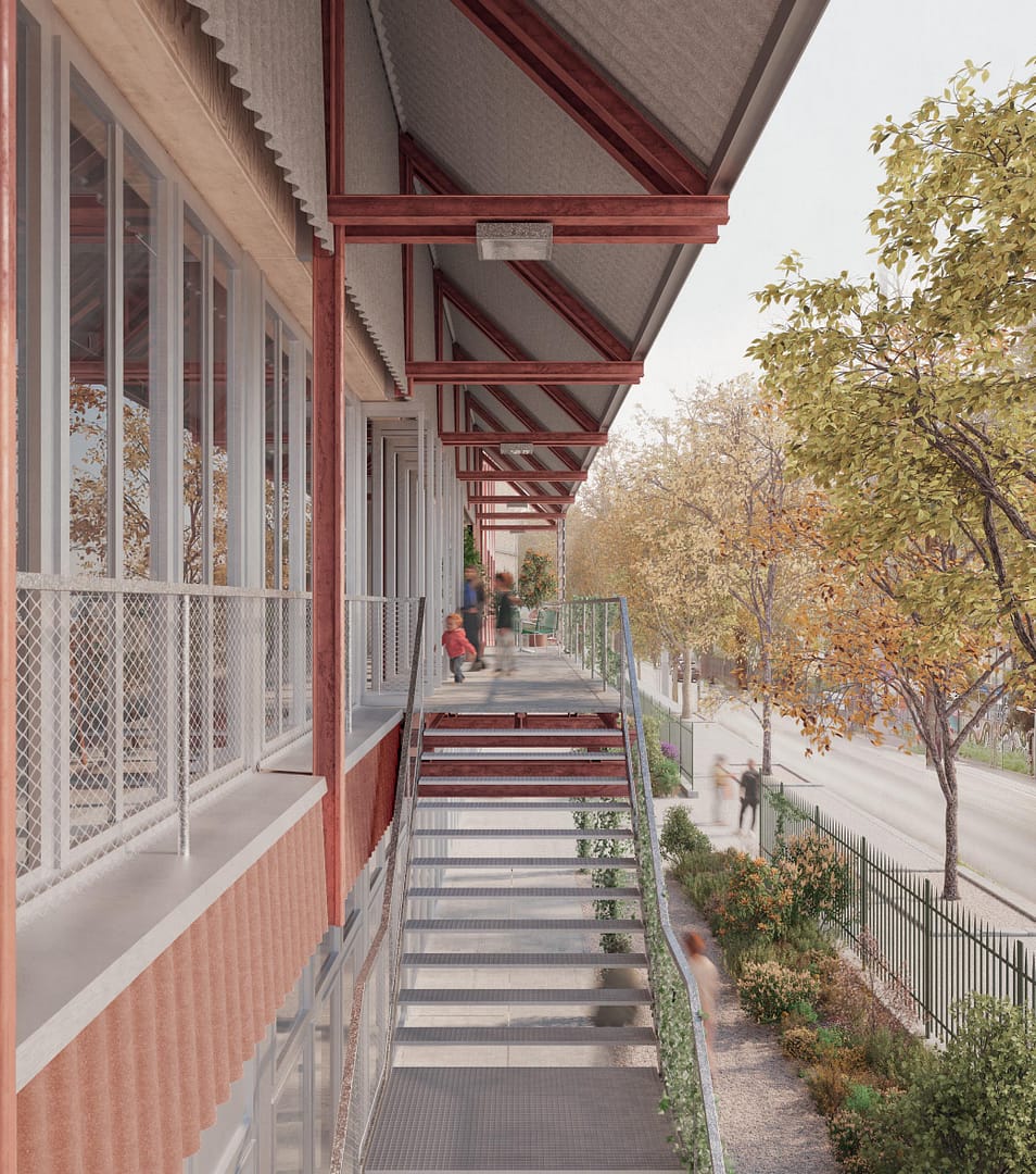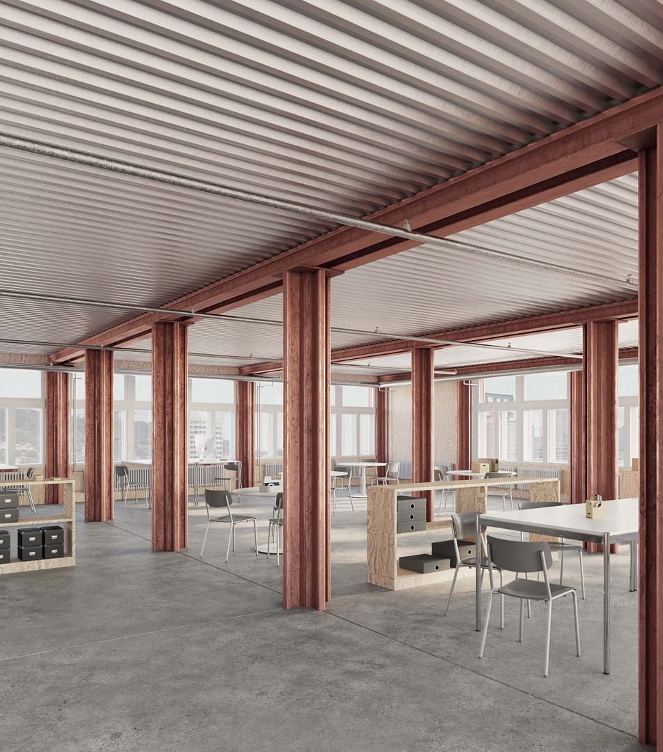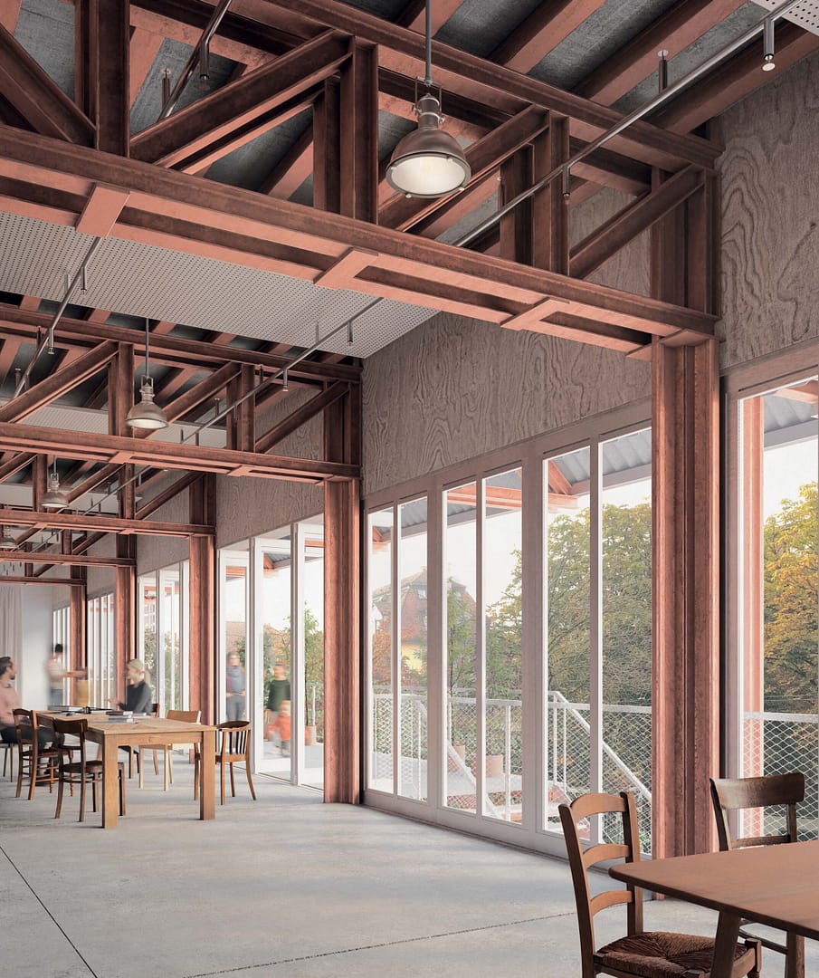 Das Projekt GLEIS X wird von der Jury einstimmig zur Weiterbearbeitung empfohlen. Das Entwurfskonzept basiert auf einer konsequenten ReUse-Strategie und überrascht insbesondere mit der unkonventionellen Verwendung von 12 km gebrauchten Schienen aus dem SBB Resale (Materiallager) als Tragwerk. Die gebrauchten Schienen kommen als Stützen und Deckenträger der Hauptgeschosse zum Einsatz. Die Gebäudehülle ist aus Holzelementen mit ReUse-Fenstern als Kastenfenster und einer Verkleidung mit ReUse-Welleternitplatten konstruiert. Die vorwiegende Verwendung von ReUse-Elementen, die Berücksichtigung der Zielvorgaben für die Treibhausgasemissionen (THG) in der Erstellung und die Betonung der Zirkularität machen das Projekt GLEIS X zu einem herausragenden Beispiel für nachhaltiges Bauen. Gleichzeitig ergänze der Gewerbebau das Werkstadtareal um ein passendes und beeindruckendes Werkstück, schreibt die Jury in ihrem Fazit.